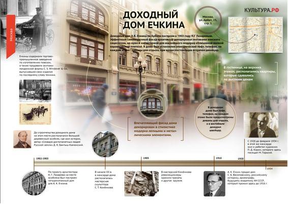 Четырехэтажный доходный дом Ечкина на Арбате построен в модном в начале прошлого века стиле модерн. В XIX веке на этом месте стоял деревянный особняк автора «Словаря достопамятных людей Русской земли», историка, тобольского и виленского губернатора Дмитрия Николаевича Бантыш-Каменского.