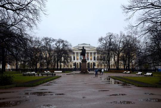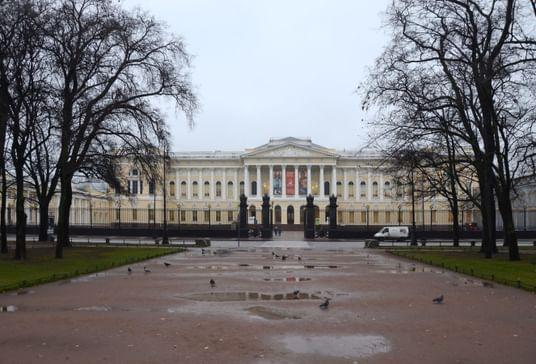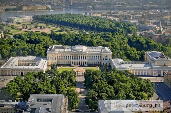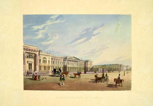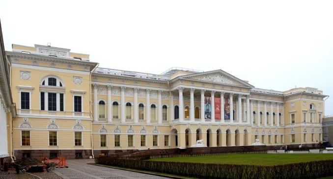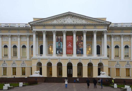 Масштаб столичного дворцового строительства представляет созданный Росси ансамбль Михайловского дворца (1819–1825). И здесь зодчий выступает как искусный градостроитель, соединяя площадь перед дворцом через Михайловскую улицу с Невским проспектом. От него открывается прекрасный вид на торжественный восьмиколонный коринфский портик дворца и нарядный, насыщенный декором фасад. Белая гостиная Михайловского дворца — ценнейший подлинный интерьер XIX в. Каждый элемент внутреннего убранства — искусственный мрамор стен, росписи, позолота, мебель и наборные паркеты, драпировки и осветительные приборы — продуман и прорисован архитектором как часть единого художественного замысла. Присущий ампиру синтез искусств в творчестве Росси достиг апогея.