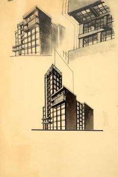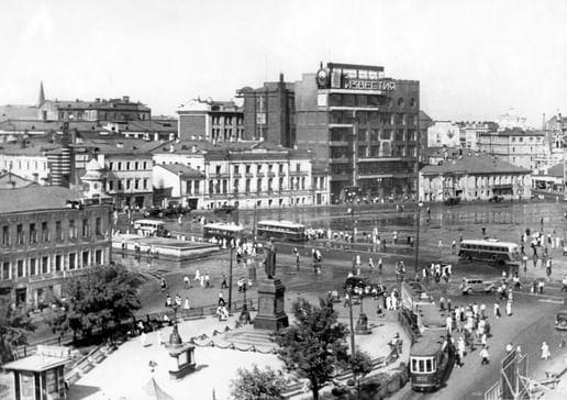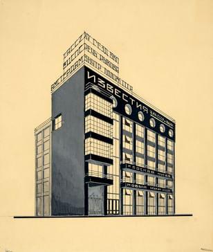 В 1925 году на углу Страстной (Пушкинской) площади и Тверской улицы было решено построить новый комплекс издательского дома газеты «Известия», проектирование которого поручили архитектору Г.Б. Бархину. Дом «Известий» состоял из двух параллельных корпусов — редакционно-издательского и производственного. Они соединялись между собой лестничным блоком с лифтами и санитарными узлами и образовывали в плане скошенную букву «П», вписанную в трапециевидную форму участка.