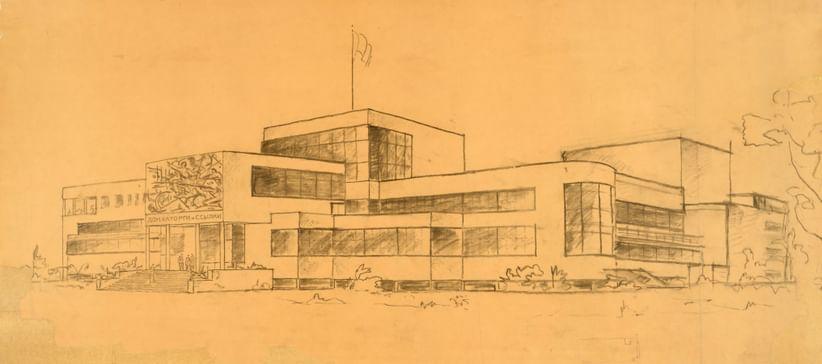 Протяженное по горизонтали крыло, где должен был располагаться музей, уравновешивало сложную композицию из разновысотных объемов клуба. Основной доминантой строения стал мощный кубический объем малого зала, выступающий глухой торец которого нависает над четырехколонным портиком главного входа. К портику поднимается широкая лестница, ведущая на второй этаж, где расположены гардероб и фойе Большого зрительного зала. Фасадную плоскость высокого параллелепипеда фойе прорезает облегчающая массу стеклянная стена. Горизонтальные ленты окон оживляют геометрические объемы здания, плоские крыши которого были задуманы как открытые террасы. Правое крыло строения замыкает большой остекленный цилиндр, в котором разместилась винтовая лестница.