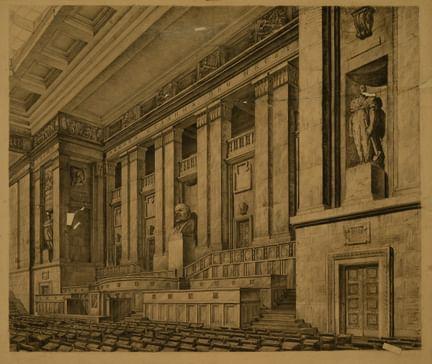 Зал заседаний, рассчитанный на 3000 человек, выступает полуротондой с тыльной стороны. Дневной свет проникает через стеклянный потолок, вокруг которого в кессонах расположены искусственные источники света. Помимо большого зала, в здании было запроектировано около 700 рабочих кабинетов, 10 малых залов заседаний, библиотека, столовая и др. В отделке интерьеров были использованы гранит, белый и красный мрамор, ценные породы дерева.