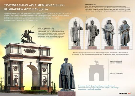 Триумфальная арка в Курске была построена в 2000 году. Это первая арка в мире, посвященная победе над фашизмом. В ее строительстве участвовали московские инженеры, петербургские литейцы, бетонщики с немецкого завода в курской Судже и атомщики из Курчатова. Триумфальная арка входит в состав мемориального комплекса «Курская дуга».