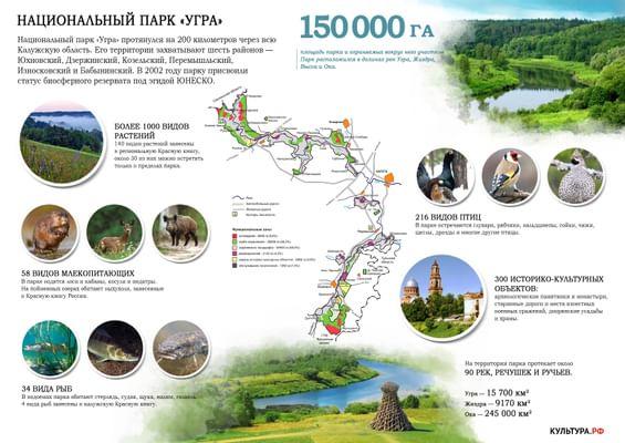Место «Великого стояния на Угре», старинные обители, захоронения советских воинов и редкие краснокнижные растения. В 2002 году Национальному парку «Угра» присвоили статус Биосферного резервата под эгидой ЮНЕСКО.