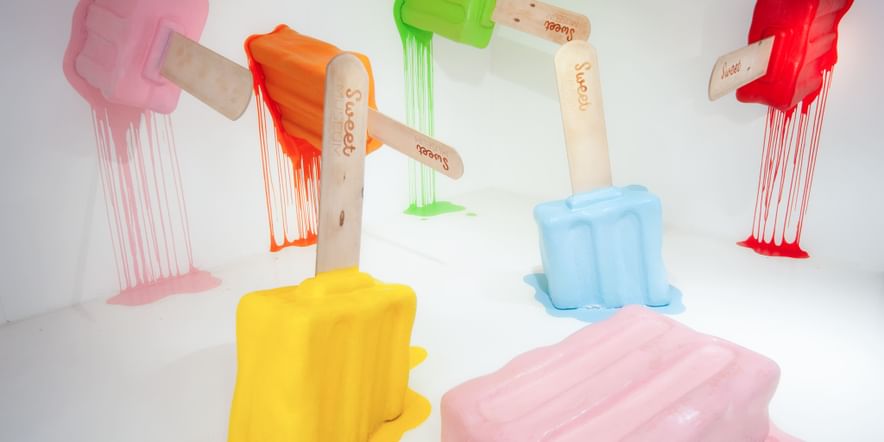 В музее можно прогуляться среди громадных леденцов, поваляться на гигантских маршмеллоу, погладить единорогов, сделать селфи с пингвинами, покататься на качелях из сахарной ваты, посидеть на коленях у розового Будды, загадать желание, стоя под двойной радугой.