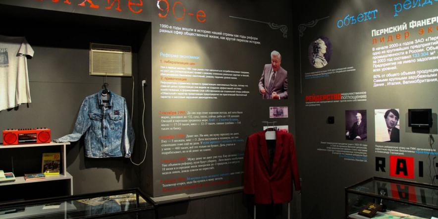 Особое место занимает экспозиция «Музей истории рейдерства». Здесь можно увидеть информацию по истории морского разбоя, фотографии кораблей-рейдеров, атрибутику пиратов. «Лихие 90-е» представлены оригинальными предметами эпохи, среди которых малиновый пиджак, приватизационный чек, акции Пермского фанерного комбината, кубик Рубика и другие экспонаты.