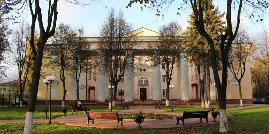 Дом культуры, величественное здание с греческими колоннами в дорическом стиле, которое находится на въезде в город,