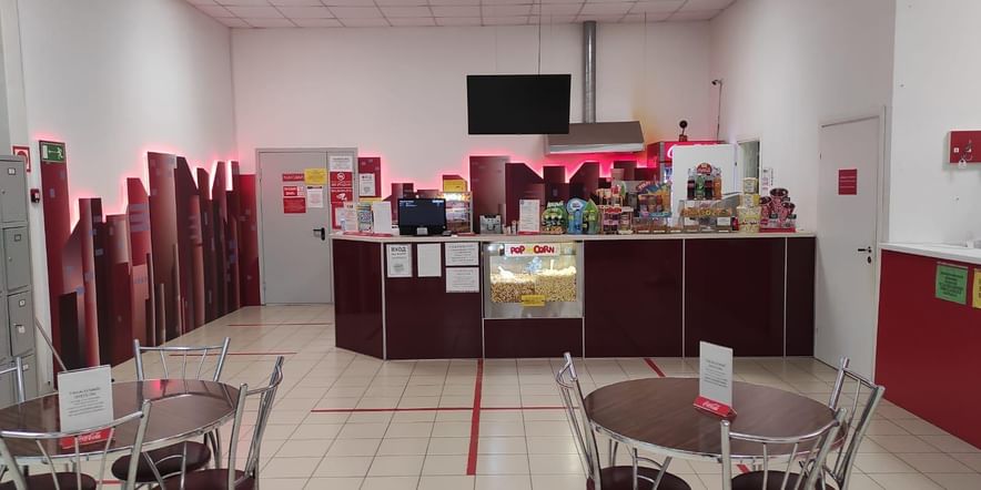 На территории кинотеатра работает кинобар, в котором можно приобрести прохладительные напитки и попкорн.