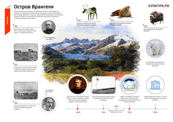 Судя по находкам археологов, первые люди здесь появились за 1750 лет до н. э., на карты же остров Врангеля был нанесен в середине XIX века. В 1921 году начинается колонизация острова: сперва сюда прибывают поселенцы из США и Канады, а в 1924-м над островом поднят советский флаг. Первая полярная станция под руководством русского исследователя Арктики Георгия Ушакова была создана уже в 1926 году.