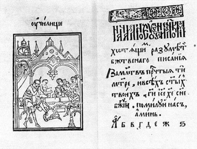 Первый букварь печатник выпустил в 1574 году во Львове. «Ради скорого младенческого научения», — написано от составителя. Алфавит расположен в прямом, обратном порядке и вразбивку. 40 листов по 15 строчек на каждой страничке написаны на старославянском с черным орнаментом из сплетенных листьев, бутонов, цветов и шишек, характерных для издания Федорова. Ученые склоняются к мнению, что это «первый печатный учебник грамоты для восточных славян». Единственный известный экземпляр федоровской «Азбуки», сохранившийся до наших дней, находится в библиотеке Гарвардского университета. Предполагается, что некогда книга принадлежала собирателю предметов старины Григорию Строганову, у наследников графа раритет купил Сергей Дягилев, а уж затем книга попала за океан.