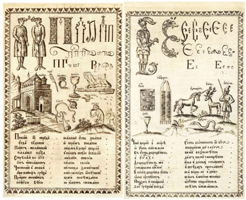 Первая иллюстрированная русская азбука с витиеватым названием: «Букварь славянороссийских писмен уставных и скорописных, греческих же, латинских и польских со образованиями вещей и со нравоучительными стихами: Во славу Всетворца Господа Бога и в честь Пречистыя Девы Богородицы Марии и всех святых». Первые экземпляры издатель и учитель детей царской фамилии Карион Истомин преподнес матери Петра Великого — царице Наталии Кирилловне — для внука ее царевича Алексея. Оформление сообразно статусу — рукописная книга расписана золотом и красками. Печатное издание вышло в 1694 году в 106 экземплярах. 43 гравированных на меди листа, на каждом — буквица из человеческих фигур, предметы на эту букву и нравоучительные пояснения. Рисунки выполнил Леонтий Бунин — ученик голландского гравера Оружейной палаты Схонебека. Один из экземпляров «Букваря» Истомина хранится в петербургской Публичной библиотеке.