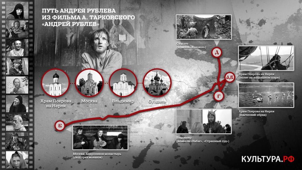 Портал «Культура.РФ» предлагает отправиться в путешествие с киногероями и повторить их маршрут в реальной жизни. Мы составили карту передвижений персонажей «Покровских ворот» Михаила Козакова, «Золотого теленка» Михаила Швейцера, «Андрея Рублева» Андрея Тарковского. Как менялся маршрут аспиранта Костика зимой и летом? Где располагалась коммунальная квартира, в которой жили герои «Покровских ворот»? С какого вокзала Великий комбинатор Остап Бендер отправился в путешествие по Туркестано-Сибирской магистрали? В каких городах находились храмы, которые расписывал Андрей Рублев? Ответы на эти вопросы вы узнаете из нашей инфографики.